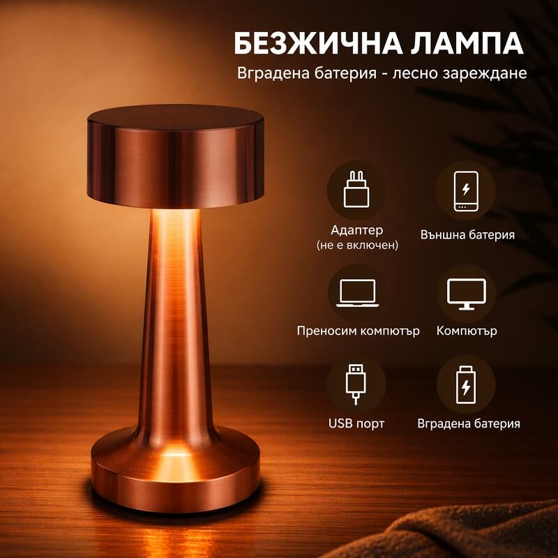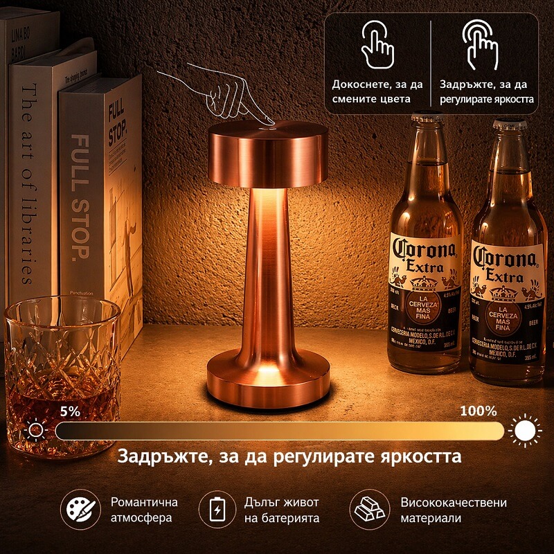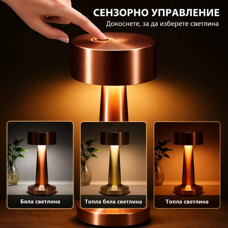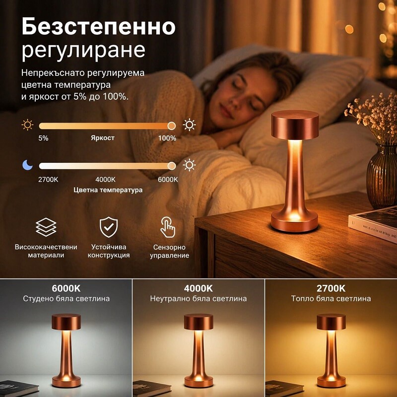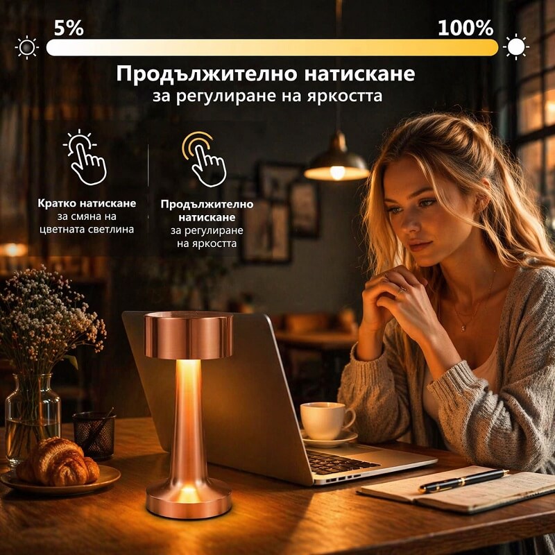 Тя съчетава сензорно управление, димиране, 3 режима на светлина, USB Type-C зареждане и елегантно метално присъствие в един завършен продукт.