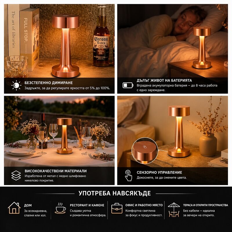 Липсата на постоянен кабел превръща този модел в много добро решение за нощни шкафчета, помощни масички, декоративни кътове, рецепции, ресторантски маси и места, където традиционната лампа би изглеждала по-тежка или неудобна.