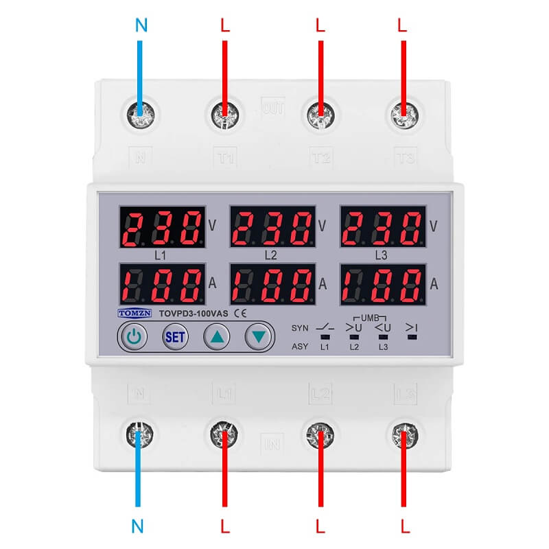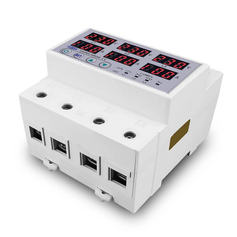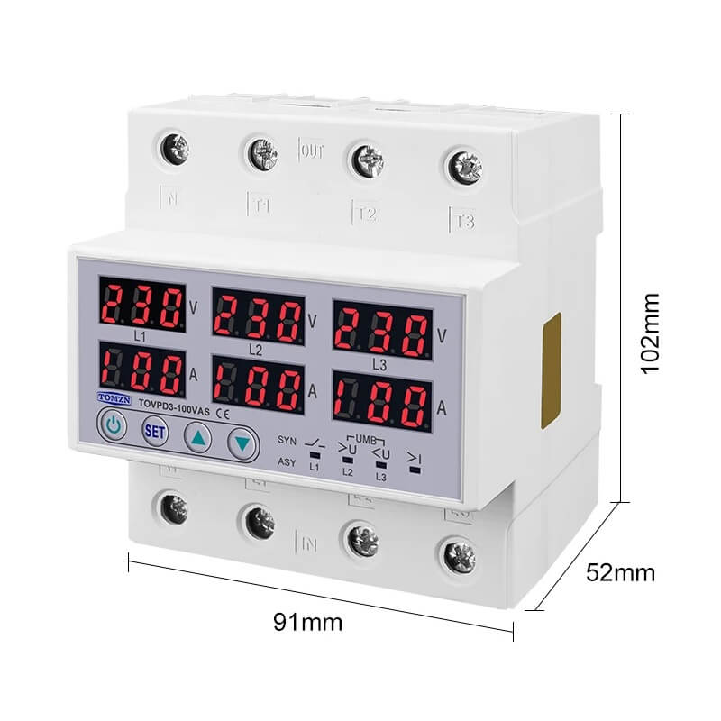 Tomzn TOVPD3-100VAS е трифазно реле със защита от високо напрежение, ниско напрежение, претоварване по ток, фазов дисбаланс и неправилна последователност на фазите, създадено за надеждна работа в трифазни електрически системи.