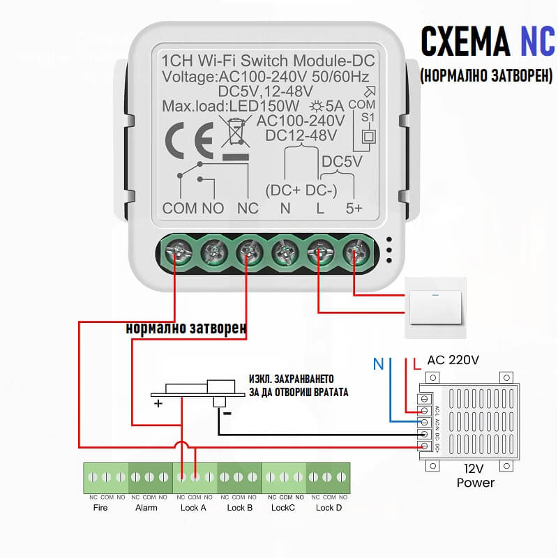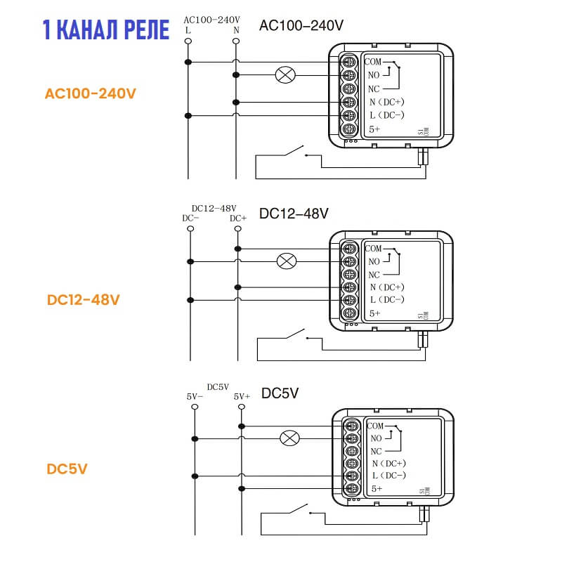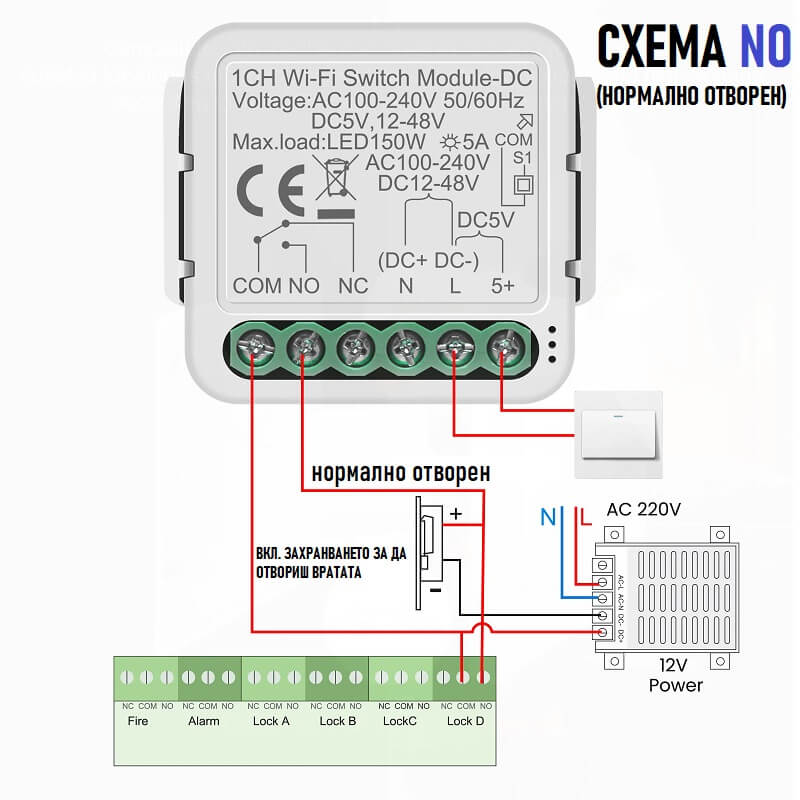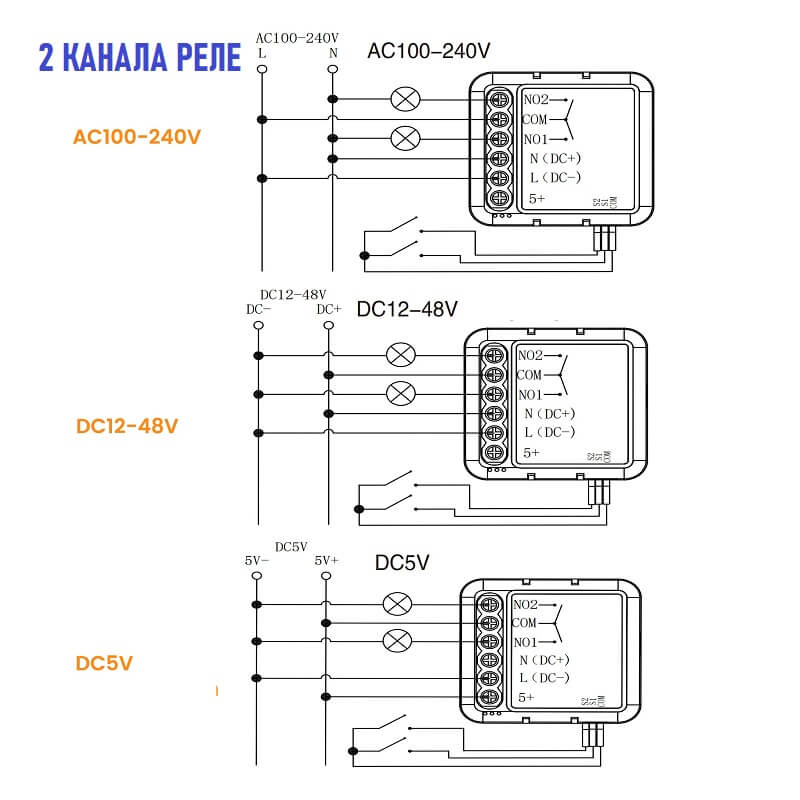 • Свържете модула към захранването според схемата (AC 100–240V или DC 5–48V).