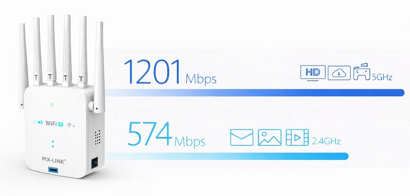 Максималните скорости на WiFi усилвателя са 5GHz честота: до 1201Mbps, 2.4GHz честота: до 574Mpbs.